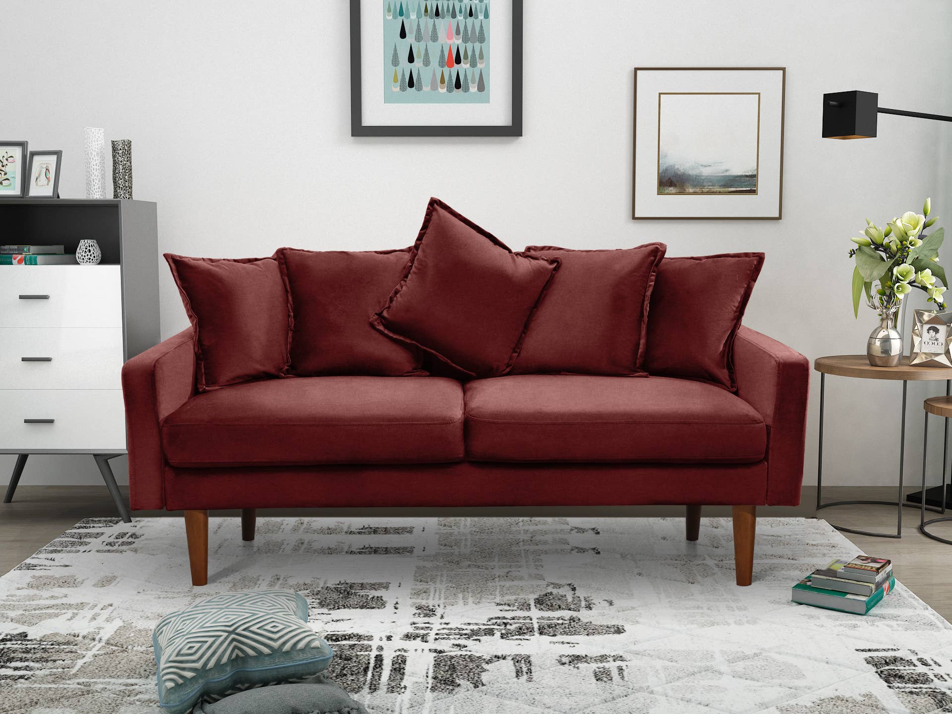 This sofa will be the final piece of your carefully curated collection. Beautifully styled with multiple back cushions and consciously crafted with a solid Eucalyptus wood frame, round arms, and tapered wooden legs. Then finish up with cloud-soft velvet upholstery wrapped around high-density foam seat cushions for maximum comfort. It's just a perfect addition to any living space.